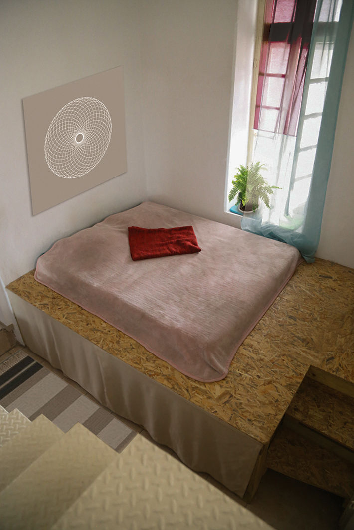 איזור השינה הוגבה על במת עץ, החלל מתחתיה הפך לארון ושטח איחסון - ביחד נוצרו בידוד והרחקה מהרצפה שהיא תקרת המועדון.
